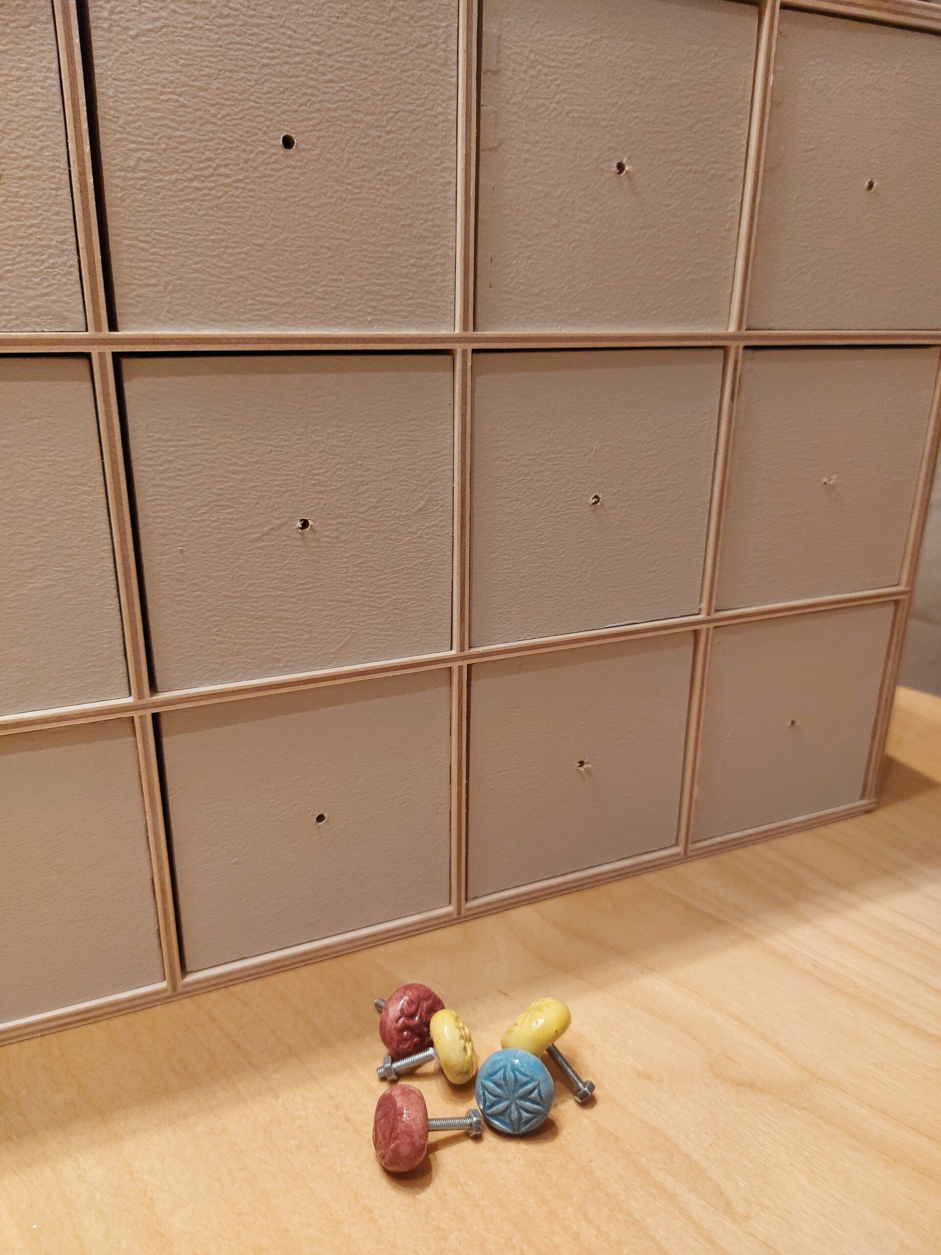 Zum Schluss habe ich dann noch eine Schicht matten Transparentlack auf den Oberflächen auftragen (als Schutz) und nachher die Knöpfe einfach mit den Muttern an den Schubladen angebracht.